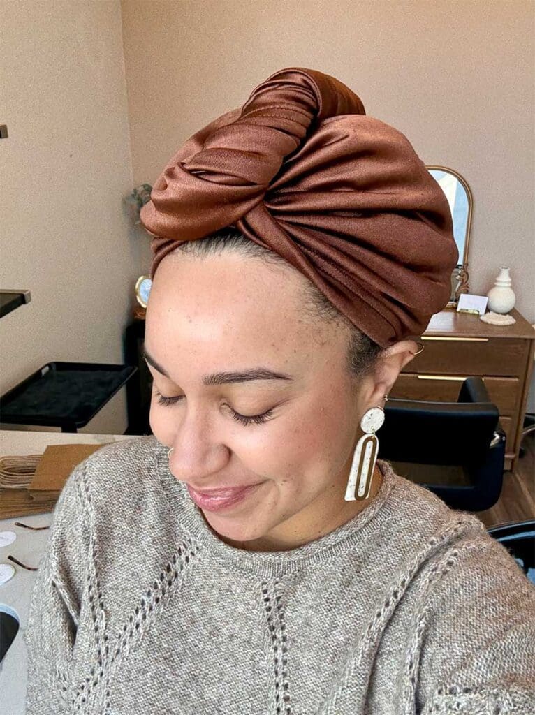 If you’ve got curly extensions, you’ll need more space. Go with an extra-long satin bonnet or a stretchy turban you can tuck the hair into. You’ve got way more length and volume to protect, and you don’t want it hanging out getting smushed or tangled overnight. I always walk my extension clients through nighttime care, because it makes a huge difference in their extension’s longevity.